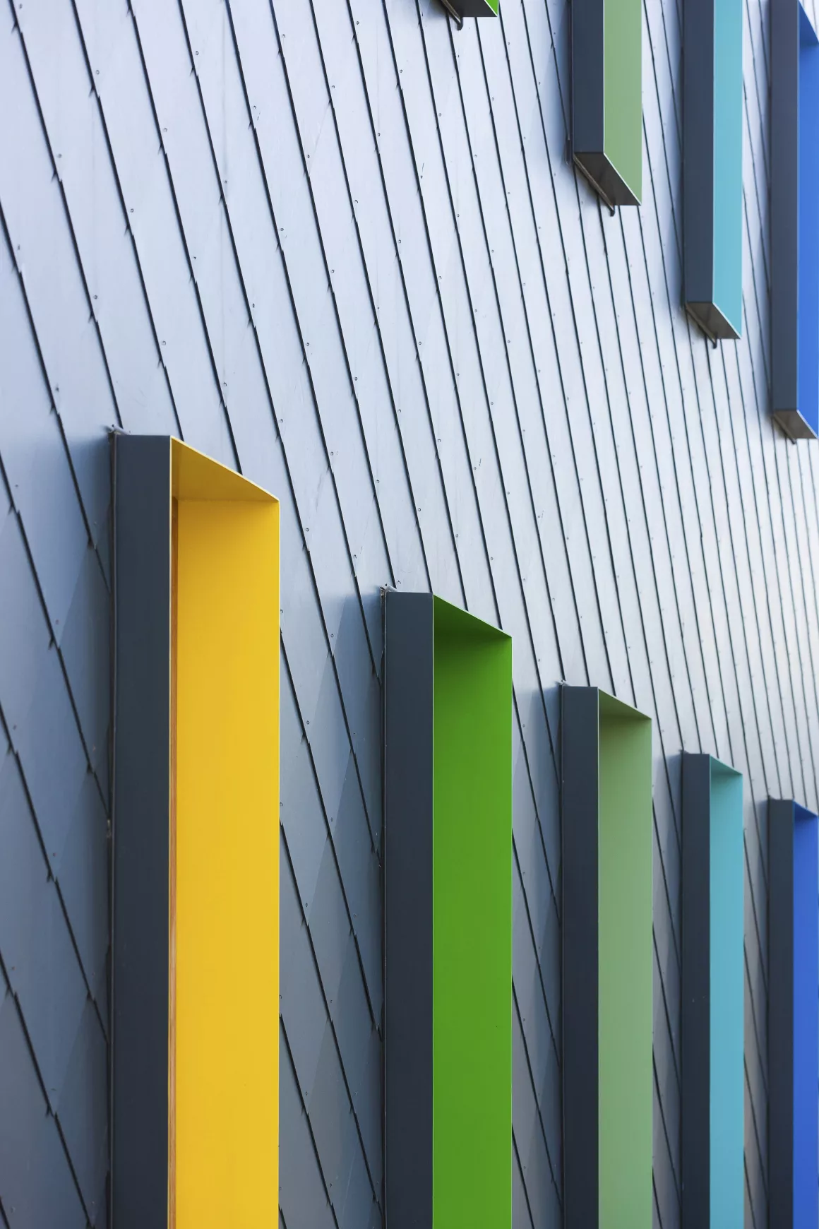 La nouvelle enveloppe permet de répondre aux exigences en matière de performance thermique actuelle au moyen d’une ardoise traditionnellement mise en œuvre. Elle unifie un projet hétérogène tout en utilisant les apports solaires gratuits. Les touches de couleurs ponctuelles soulignant le sas d’entrée ou les percements signalent l’identité scolaire de ce bâtiment.